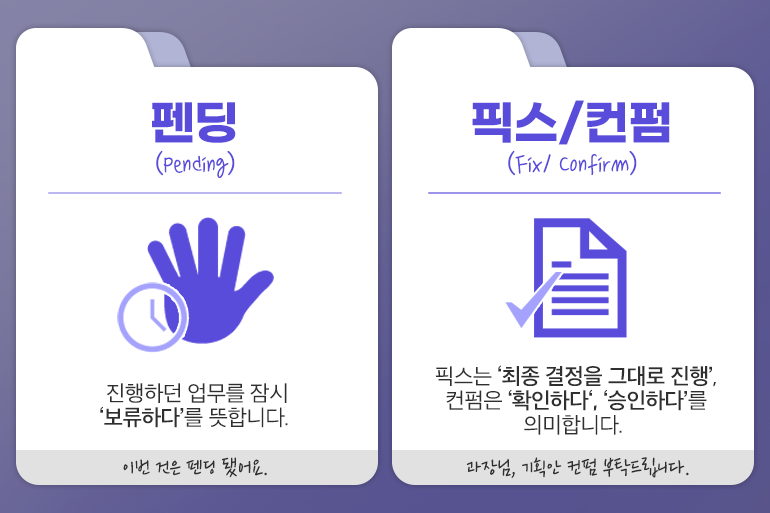 하나의 업무가 실행되는 과정에서 수많은 사람들의 의견이 오고 가고, 복잡한 보고 체계를 거치게 되는데요. 그러다 보면 업무 진행 여부가 최종적으로 어떻게 결정되었는지 파악하기가 쉽지 않습니다. 만약 진행 상황에서 ‘펜딩(Pending)’이라는 용어를 발견했다면 진행하던 업무를 잠시 보류한다는 의미이므로 주어진 다른 업무에 집중해도 무방합니다.