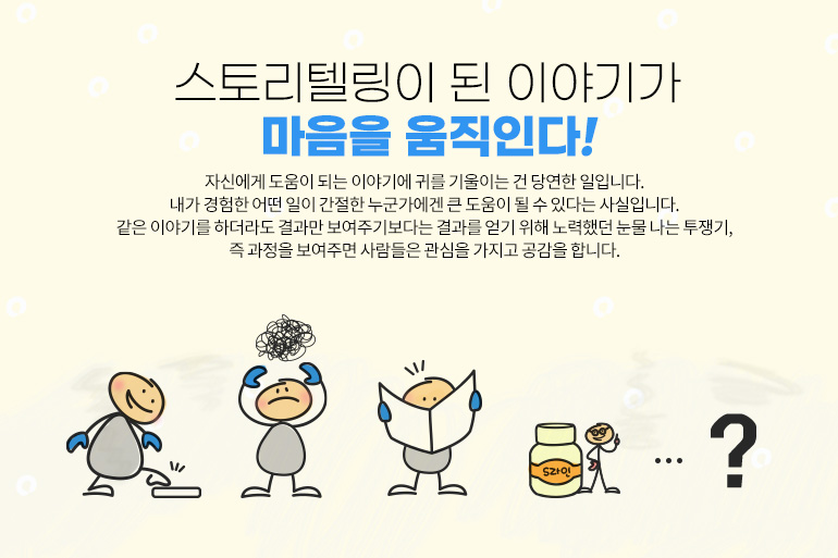하루라는 시간을 살면서 우리는 많은 정보를 마주하며 살고 있습니다. 서로 봐달라고 아우성치는 것 같습니다. 하지만 우리는 그 모든 정보를 기억하면서 살지는 않습니다. 그래도 내 눈길을 사로잡고, 관심이 생기게 한 이야기가 있다면 어떤 것일까요? 아마 생생하게 이미지가 그려지는 이야기, 그리고 나와 관련이 있는 정보가 들어있는 이야기일 것입니다. 같은 정보를 접하더라도 설명을 듣는 것과 스토리텔링이 된 이야기는 차이가 있는데요. 자신을 홍보하는 사람은 나만의 이야기, 제품을 홍보하기 위해선 제품의 이야기가 스토리텔링 되어야 할 것입니다.