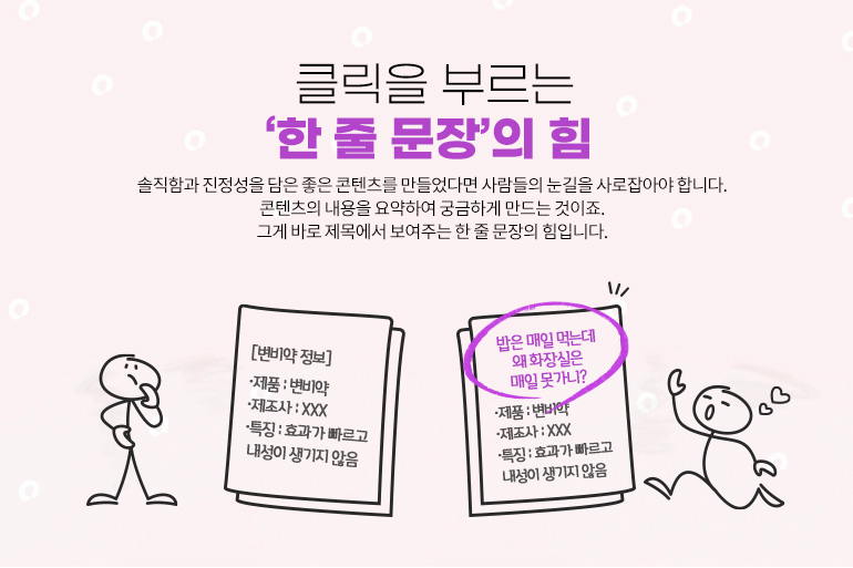 제목에서는 콘텐츠를 봤을 때 사람들에게 이득이 되는 점을 강조하거나, 내용에 대한 무언가를 하지 않았을 때 손해 볼 수 있다는 점 등을 어필하면 클릭을 할 수밖에 없을 것입니다. 제목에서는 단호하고 힘이 느껴지는 문장을 쓰면 설득력이 있습니다. 최초나 최고라는 말 등의 순위를 나타내는 말이 들어가면 눈을 좀 더 사로잡을 수 있고, 같은 단어를 반복하면서 강조해 주는 것도 방법이 될 수 있습니다. 그 한 줄에서 사람이나 제품의 정체성이 보인다면 더없이 좋겠죠.