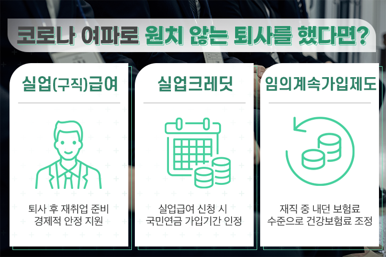 실업급여(구직급여) 신청 시 국민연금을 유지하고 싶다면 국민연금 보험료의 일부를 국가가 지원하고, 그 기간을 국민연금 가입기간으로 인정하는 ‘실업크레딧’을 신청할 수도 있어요. 국민연금 보험료의 75%는 국가에서, 본인 부담은 25%로 생애 최대 12개월까지 지원을 받을 수 있답니다. 국민연금 공단이나 고용노동부 고용센터 등을 통해 신청할 수 있으니 실업급여를 받고 있는 분들이라면 신청해 보셔도 좋겠네요! 또한 퇴사 후 지역가입자로 전환되었을 때 재직 당시보다 더 높은 건강보험료를 내야 한다면 ‘임의계속가입 제도’를 통해 재직 중 내던 보험료와 비슷한 비용을 납부할 수 있어요. 단, 지역가입자로 전환된 후 2개월 내에 ‘임의계속가입’을 신청해야만 혜택을 받을 수 있답니다. 자세한 사항은 관련 홈페이지(https://www.easylaw.go.kr/)에서 확인하면 더욱 편리할 거예요.