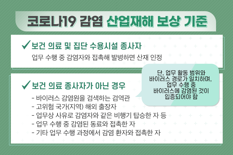우선 1) 바이러스 감염원을 검색하는 공항, 항만 등 검역관 2) 고위험 국가(지역) 해외 출장자 3) 업무상 사유로 감염자와 같은 비행기를 탑승한 자 4) 업무수행 중 감염된 동료 근로자와 접촉이 있었던 자 5) 기타 업무수행 과정에서 불가피하게 감염 환자와 접촉한 자는 업무상 질병 조사 대상에 포함이 됩니다. 단, 업무 활동 범위와 바이러스 전염 경로가 일치하거나 업무 수행 중 바이러스에 전염될 상황임이 인정되어야 산재 보상이 가능해요. 또한 바이러스에 노출되었다고 인정되고, 가족이나 친지 등 일상에서 전염되지 않았다는 것을 입증해야 한답니다.