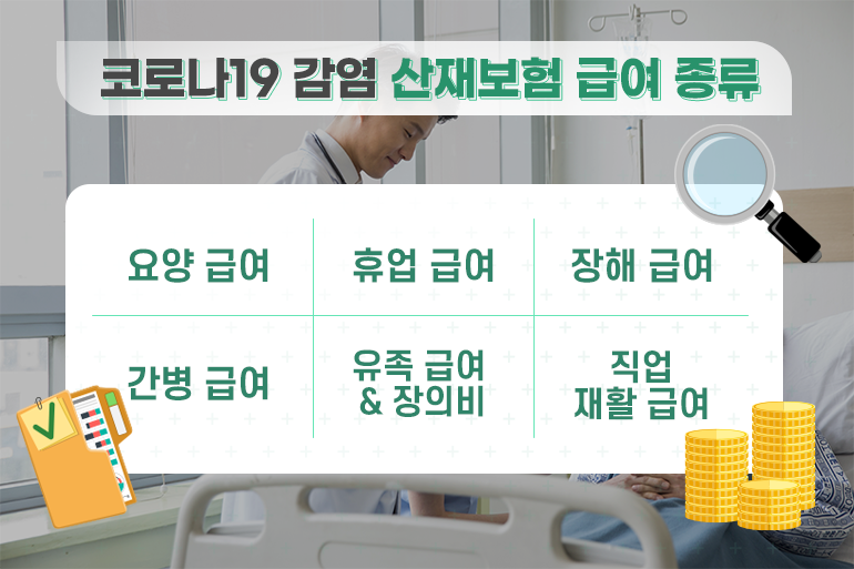이러한 심의 절차를 거쳐 코로나를 산업재해로 인정받게 되면 요양 급여, 휴업 급여, 장해급여, 간병 급여, 유족 급여, 장의비, 직업재활급여 등 총 7개의 산재보험급여 중 본인에게 해당되는 지원을 받게 됩니다. 근로복지공단 홈페이지(https://www.kcomwel.or.kr)를 통해 신청 및 문의가 가능하니 참고해 주세요.