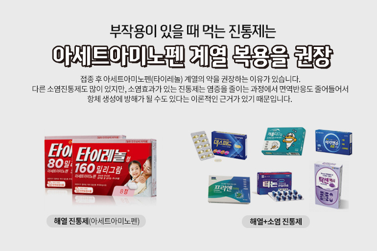 두 번째로는 부작용이 있을 때 먹는 진통제에 관한 내용입니다. 흔히 접종 후 아세트아미노펜(타이레놀) 계열의 약을 권장하는 이유가 있습니다. 다른 소염진통제도 많이 있지만, 소염효과가 있는 진통제는 염증을 줄이는 과정에서 면역반응도 줄어들어서 항체 생성에 방해가 될 수도 있다는 이론적인 근거가 있기 때문입니다. 반면 아세트아미노펜은 소염효과는 없지만 진통과 해열 효과만 있기 때문에 항체 생성에 영향을 주지 않는다고 합니다. 물론 소염진통제가 정말로 항체 생성에 방해가 된다는 것은 이론적 근거만 있을 뿐 정확한 연구결과는 없습니다. 그래도 일차적으로는 아세트아미노펜 계열의 약 복용을 권장합니다. 만약, 그 약만으로 충분한 효과가 나타나지 않는다면 다른 소염진통제를 함께 복용하는 것도 좋은 방법입니다.