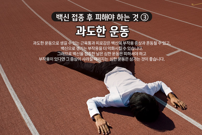마지막으로 코로나19 백신 접종 후 피해야 할 것은 ‘과도한 운동’입니다. 평소보다 심한 운동을 하는 것은 꼭 피해야 합니다. 과도한 운동으로 생길 수 있는 근육통과 피로감은 백신의 부작용 증상과 혼동될 수 있고, 백신으로 생기는 부작용을 더 악화시킬 수 있습니다. 그러므로 백신을 접종한 날은 심한 운동은 피하셔야 합니다. 더군다나 접종 후 부작용이 있다면 그 증상이 사라질 때까지는 심한 운동은 삼가는 것이 좋습니다.