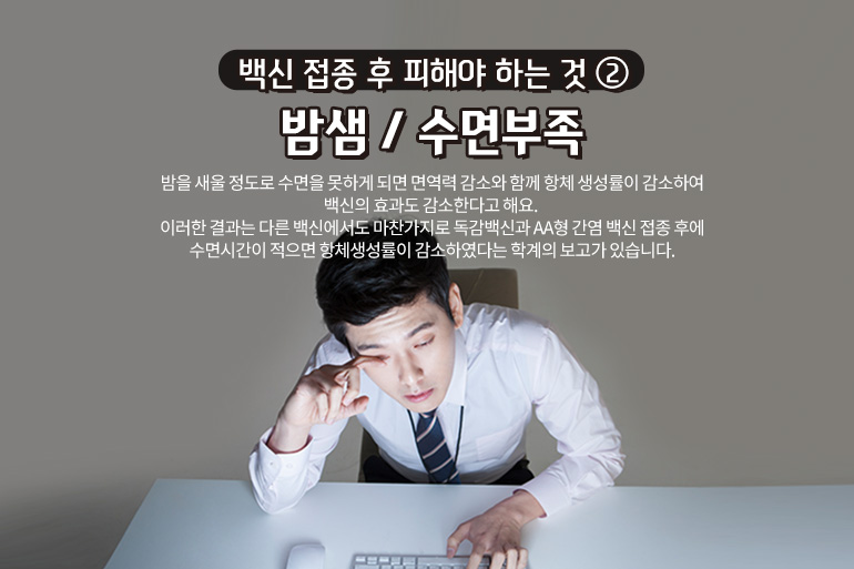 두 번째는 ‘밤샘이나 수면부족’을 피해야 합니다. 잠을 잘 자는 것은 면역력에 매우 중요합니다. 거의 밤을 새울 정도로 수면을 못하게 되면 면역력 감소와 함께 항체 생성률이 감소하여 백신의 효과도 감소한다고 해요. 이러한 결과는 다른 백신에서도 마찬가지입니다. 독감백신과 AA형 간염 백신 접종 후에 수면시간이 적으면 항체생성률이 감소하였다는 학계의 보고가 있습니다. 그러므로 백신 접종 후에는 무리한 스케줄은 잡지 않는 것이 좋고, 충분한 휴식과 수면시간을 취해야 부작용도 줄일 수 있습니다.