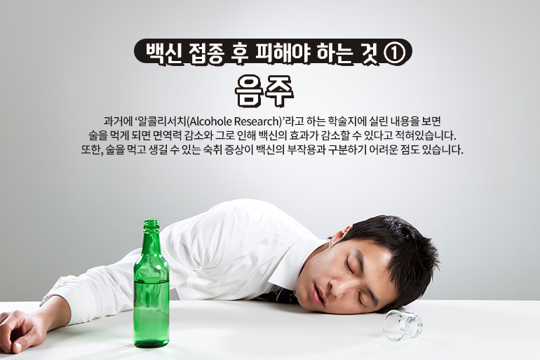 코로나19 백신접종 후 피해야 할 첫 번째는 바로 ‘음주’입니다. 코로나19 백신의 효과와 음주의 관계에 대한 정확한 연구 결과는 아직 없습니다. 그러나 과거에 ‘알콜리서치(Alcohole Research)’라고 하는 학술지에 실린 내용을 보면 술을 먹게 되면 면역력 감소와 그로 인해 백신의 효과가 감소할 수 있다고 적혀있습니다. 또한, 술을 먹고 생길 수 있는 숙취 증상이 백신의 부작용과 구분하기 어려운 점도 있습니다. 두통이나 소화불량, 기력저하, 근육통과 같은 숙취 증상이 백신의 부작용과 혼동될 수 있기 때문에, 부작용에 대한 조치를 취하기 어려운 점도 고려해야 할 부분입니다.