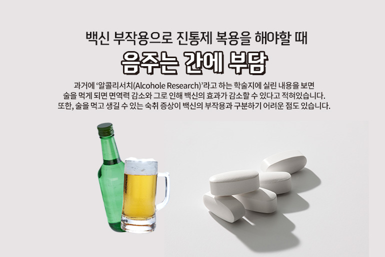 그리고 백신 부작용으로 판단되었을 때, 타이레놀과 같은 진통제를 먹게 되는데 이때도 음주를 하게 되면 문제가 생길 수 있습니다. 왜냐하면 이러한 약물은 주로 간에 부담을 주게 되는데, 술을 먹은 상태에서 이러한 진통제를 먹게 되면 간의 부담을 가중시킬 수도 있습니다. 그러므로 백신 접종한 날은 물론이고, 혹시 부작용이 생긴다면 모든 증상이 좋아질 때까지는 음주를 삼가는 것이 좋습니다.