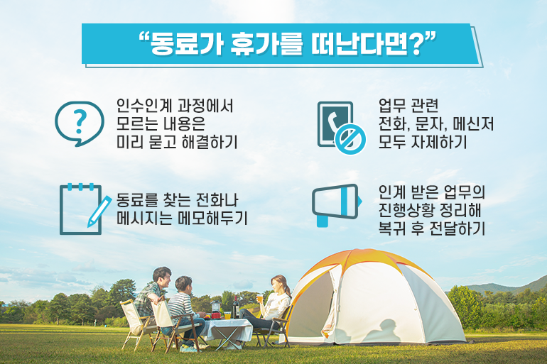 휴가 기간동안 원활하게 업무가 진행되어야 휴가를 떠난 당사자도 마음 편히 휴식을 즐길 수 있을 텐데요. 이를 위해서는 꼼꼼한 업무 인수인계가 필수죠. 업무는 한 사람에게 몰아주기보다는 여러 팀원들에게 나누어 주어야 부담을 덜 수 있어요. 공동으로 진행하던 업무는 인계하기가 쉽지만 혼자 진행하던 업무라면 같은 업무 경험이 있거나 비슷한 업무를 수행하는 동료에게 부탁하는 것이 좋겠죠.