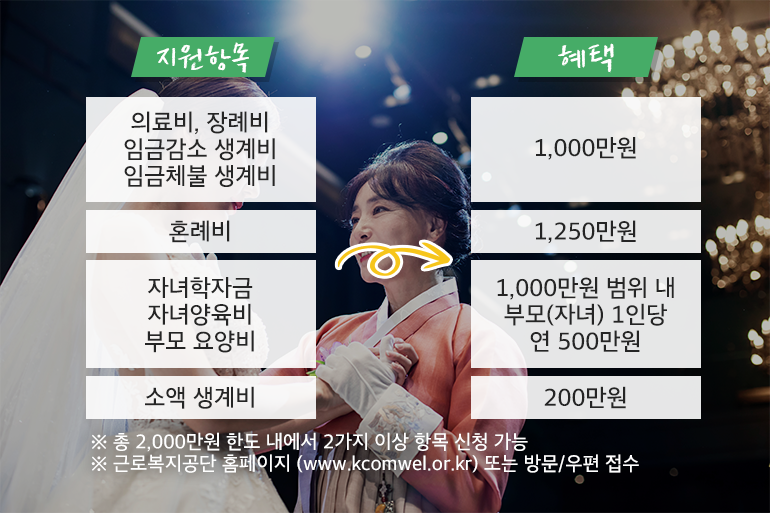 그렇다면 어떤 항목을, 얼마까지 지원받게 될까요? 의료비, 장례비는 1,000만원까지, 혼례비는 1,250만 원까지 지원이 가능해요. 부모 요양비는 1천만 원 내에서 부모 1인당 연 500만 원까지, 자녀 학자금과 양육비 역시 1천만 원 내에서 자녀 1인당 연 500만 원까지 혜택을 받을 수 있답니다. 이외에도 임금 감소 및 임금 체불 요건에 부합할 경우 1,000만 원까지 생계비 지원이 가능하며, 소액의 생계비가 필요한 경우에는 200만 원까지 지원을 받을 수 있죠.