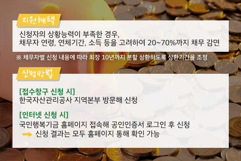 지원 대상은 '2013년 2월말을 기준으로 6개월 이상 연체된 한국장학재단 및 주택금융공사 학자금 대출 채무 중 2014년 9월 말 국민행복기금이 인수해 동 기금이 관리 중인 채무를 보유한 자'로 명시되어 있는데요. 본인이 지원대상자인지를 확인하기 위해서는 국민행복기금 전화 문의 (☎1588-3570) 또는 홈페이지(www.happyfund.or.kr) 내에서 조회가 가능하답니다.