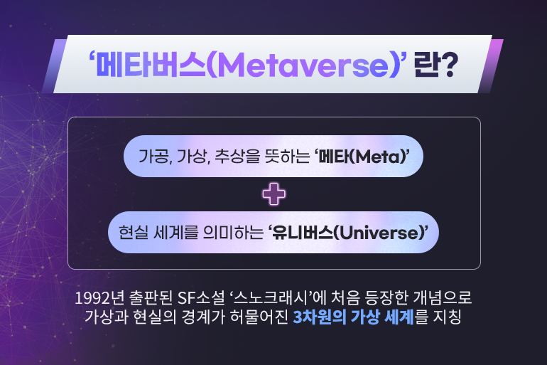 ‘메타버스’는 가공, 가상, 추상을 의미하는 ‘메타(Meta)’와 현실세계를 의미하는 ‘유니버스(Universe)’의 합성어로 1992년 출판된 SF 소설 ‘스노 크래시(Snow Crash)에서 처음 등장한 개념이에요. 가상과 현실의 경계가 어물어진 3차원의 가상세계를 뜻하죠. 과거 ‘싸이월드’ 이용자라면 메타버스를 조금 더 쉽게 이해할 수 있을 텐데요. 내 아바타인 미니미로 가상공간인 미니홈피에서 활동을 한 것이 초기 형태의 메타버스로 볼 수 있기 때문이죠. 온라인 게임 캐릭터를 생성해 게임 내에서 활동하게 만드는 것 또한 일종의 메타버스랍니다.