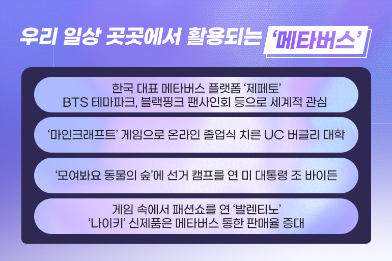 한국의 대표적인 메타버스 플랫폼 ‘제페토’에서는 BTS 테마파크를 즐길 수 있고, 블랙핑크 가상 팬사인회가 열려 4600만 명이 참여하기도 했어요. UC 버클리 대학은 오프라인 졸업식 대신 ‘마인크래프트’ 게임을 이용해 가상 졸업식을 진행했으며, 미 대통령 조바이든은 ‘모여봐요 동물의 숲’ 게임에 선거 캠프를 열어 마케팅을 펼쳤죠. 명품 브랜드 ‘발렌티노’는 게임 속에서 패션쇼를 열어 화제를 모았고, ‘나이키’ 신제품은 현실보다 메타버스에서 더 높은 판매율을 기록하기도 했어요. 이렇듯 메타버스는 우리의 일상을 완전히 새로운 차원으로 바꿔 나가고 있습니다.