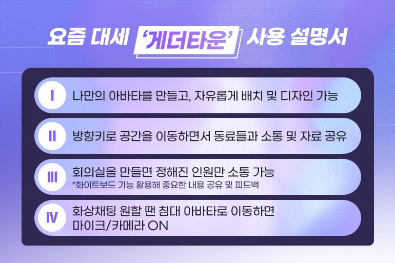 코로나로 인해 재택근무를 시행한 회사들이 늘어나면서 꼭 사무실로 출근하지 않아도 업무를 수행하고, 소통을 하는 데 문제가 없다는 걸 많은 분들이 경험했죠. 하지만 ‘줌 피로(Zoom fatigue)라는 신조어가 생길 만큼 화상 회의로 인한 부담과 스트레스는 늘어났는데요. 화상회의 플랫폼에 메타버스 요소가 결합된 가상 오피스 ‘게더타운(Gather Town)이 대안으로 주목받고 있어요. 소통의 피로는 줄이고, 협업의 효율성은 높여 많은 IT 기업에서 재택 근무에 활용하고 있죠.