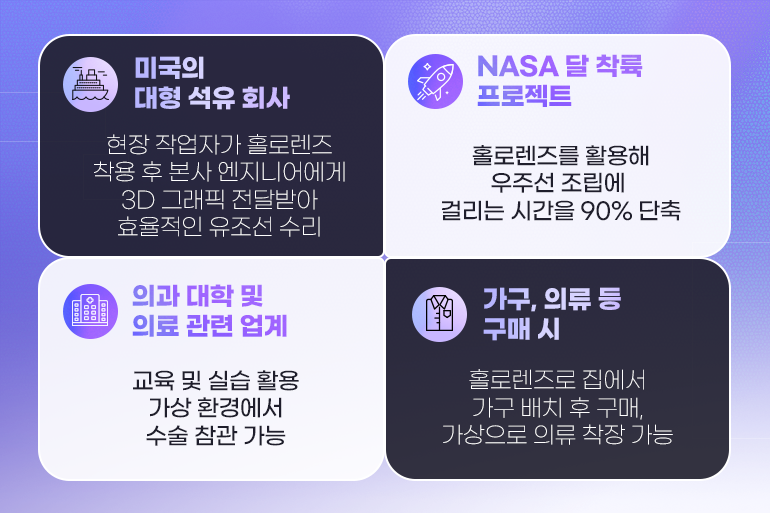 미국의 대형 석유 회사에서는 바다 위 작업자가 홀로렌즈를 쓰고, 본사의 전문 엔지니어에게 수리 방법을 3D 그래픽으로 전달받아 유조선 수리를 진행하죠. NASA의 달 착륙 프로젝트에서는 홀로렌즈를 활용해 우주선 조립에 걸리는 시간을 90% 단축하기도 했답니다.