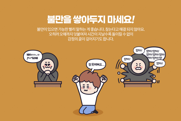 매일 직장에서 부딪히다 보면 상대에게 불만이 쌓이고 쌓이다 폭발하는 경우가 있습니다. 그래서 일보다 사람이 더 힘들다는 말이 나오죠. 수시로 생기는 갈등 속에서 누군가에게 서운하거나 불만이 있을 때 지혜롭게 관리할 줄 아는 사람이야말로 ‘직장생활의 고수(高手)’라고 할 수 있습니다. 때로는 가족들보다 더 많은 시간을 함께하는 직장 동료 간에 불만이 생긴다면 어떻게 해결해야 할까요?