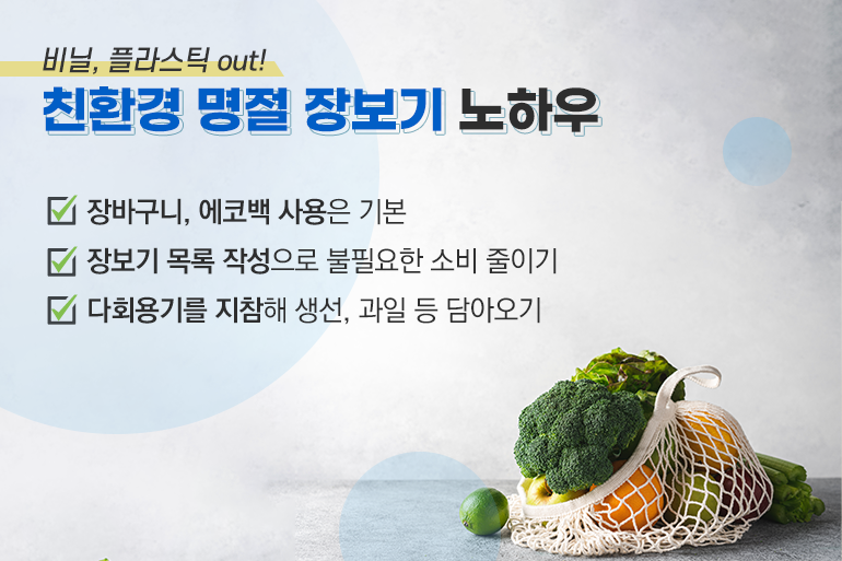 명절이면 마트나 전통 시장에 방문해 양손 가득 장을 보는 즐거움이 쏠쏠하죠. 하지만 집에 돌아와 보면 식재료 만큼이나 비닐과 각종 스티로폼 포장재도 한가득 쌓여 있는데요. 장을 보러 갈 때는 장바구니나 에코백 등을 지참하면 불필요한 소비도 줄이고, 무분별한 비닐 사용으로 인한 환경 오염도 줄일 수 있어요.