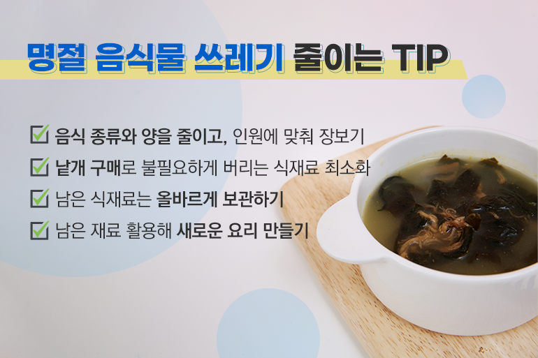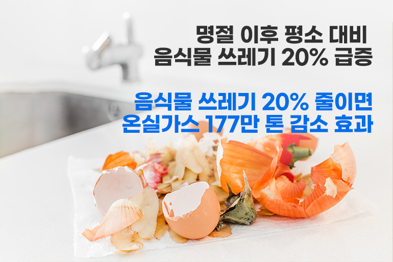 매년 명절이 끝나면 음식물 쓰레기가 평소보다 무려 20%나 급증하게 되는데요. 음식물 쓰레기 20%를 줄이면 연간 177만톤의 온실가스를 줄일 수 있다고 해요. 음식물 쓰레기를 줄이려면 먼저 음식 종류와 양을 줄이고, 인원에 맞게 장을 보는 것이 중요하죠. 낱개 포장된 제품을 이용해 불필요하게 버려지는 식재료를 줄이는 것도 좋은 방법이에요. 하나의 식재료를 다양한 요리에 활용해 식재료 구입을 최소화하고, 자투리 채소와 고기 등은 따로 모아두면 유용하게 쓸 수 있어요.