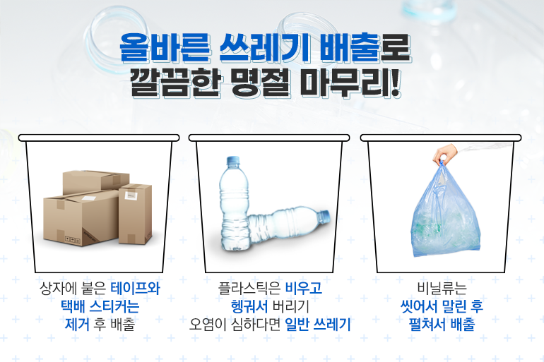 명절 이후 집안 가득 쌓인 쓰레기를 올바르게 배출하는 것 또한 친환경 명절을 위한 필수 과정인데요. 종이상자와 스티로폼 상자에 붙은 테이프와 택배 스티커는 깔끔하게 제거한 후 배출하고, 플라스틱 용기는 내용물을 깨끗이 비우고, 물로 헹군 후 배출해야 해요. 단, 투명 페트병은 라벨을 제거하고 전용 배출함에 배출하고, 오염이 심한 플라스틱은 일반 쓰레기로 버려야 하죠. 비닐류는 씻어서 말린 후, 접거나 매듭을 묶지 않고 펼쳐서 배출해야 재활용이 가능하답니다.