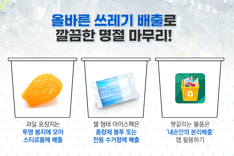 과일 포장에 사용되는 스티로폼은 내용물이 보이도록 투명 봉지에 담아 스티로폼으로 버리고, 젤 형태의 아이스팩은 종량제 봉투에 배출하거나 전용 수거함에 넣어주세요. 보자기나 부직포 가방, 알루미늄 포일은 재활용이 불가하니 종량제 봉투에 담아 버려야 한답니다. 소, 돼지, 닭, 생선 등의 뼈, 어패류, 계란 껍데기, 양파껍질 역시 음식물이 아닌 일반 쓰레기로 배출해야 한다는 것도 기억해 주세요! 그래도 헷갈리는 쓰레기가 있다면 환경부에서 만든 앱 '내손안의 분리배출'의 도움을 받아보도록 해요.