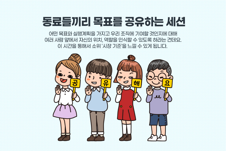 어떤 목표와 실행계획을 가지고 우리 조직에 기여할 것인지에 대해 동료들이 모여서 함께 공유하는 시간을 가지라는 겁니다. 여러 사람 앞에서 자신의 위치, 역할을 인식할 수 있도록 하라는 건데요. 이 시간을 통해서 소위 ‘시장 기준’을 느낄 수 있게 됩니다. ‘저 사람도 저 정도 하는데 나는 좀 더 해야겠네’를 스스로 느끼게 되죠. 좀 더 도전적으로 업무 목표를 잡으라는 잔소리를 하지 않아도 건강한 경쟁의 효과가 나타나는 겁니다.
