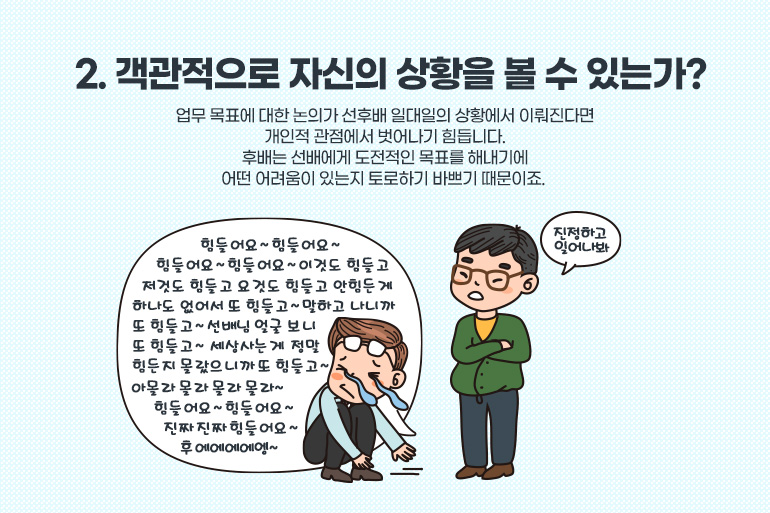 업무 목표에 대한 논의가 선후배 일대일의 상황에서 이뤄진다면 개인적 관점에서 벗어나기 힘듭니다. 후배는 선배에게 도전적인 목표를 해내기에 어떤 어려움이 있는지 토로하기 바쁘기 때문이죠. 그래서 일대일 관계가 아닌 일대다의 관계로 만드는 것이 필요합니다.