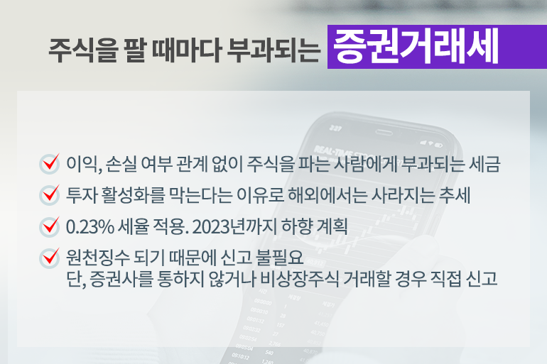 국내 주식을 통해 한 번이라도 거래를 진행했다면 누구나 납부했을 세금이 ‘증권거래세’예요. 주식을 파는 사람에게 부과되는 세금으로, 이익을 볼 때뿐 아니라 손실이 발생할 경우에도 동일하게 부과하고 있죠. 단타 위주의 투기성 거래를 방지하기 위해 만들어진 세금이지만 주식 시장 활성화를 막는다는 이유로 미국, 독일, 일본 등 해외에서는 거래세를 부과하지 않는 추세예요.