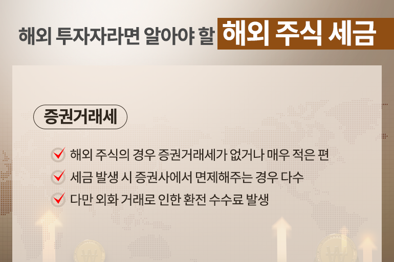 우선 해외주식은 증권거래시 발생하는 ‘증권거래세’가 없거나 매우 적어 증권사 자체에서 면제를 해주는 경우가 많아 크게 신경 쓸 필요가 없죠. 다만 외화로 주식을 사고팔기 때문에 환전에 따른 수수료가 발생하는데요. 국가별로, 증권사별로 수수료는 다르기 때문에 비교 후에 거래를 하는 것이 좋겠죠?