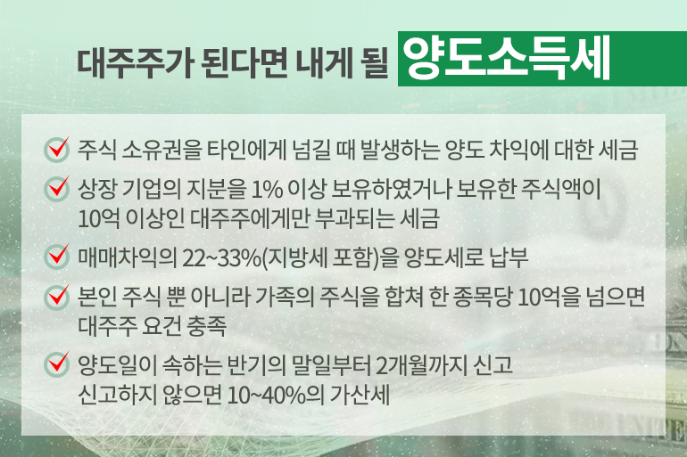 ‘양도소득세’는 주식 소유권을 타인에게 넘길 때 발생하는 양도 차익에 대한 세금을 말해요. 모든 주주가 주식을 양도할 때 내는 것이 아닌 상장 기업의 지분을 1% 이상 보유하였거나 보유한 주식액이 10억 이상인 대주주에게만 부과되는 세금으로 ‘부자 세금’이라고도 불리죠. 매매차익의 22~33%(지방세 포함)을 양도세로 내야 하기 때문에 세금 비용 또한 매우 큰 편이에요.