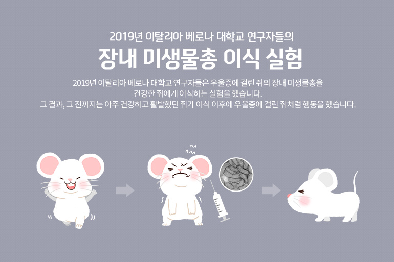 2019년 이탈리아 베로나 대학교 연구자들은 우울증에 걸린 쥐의 장내 미생물총을 건강한 쥐에게 이식하는 실험을 했습니다. 그 결과, 그 전까지는 아주 건강하고 활발했던 쥐가 이식 이후에 우울증에 걸린 쥐처럼 행동을 했습니다. 또 중국에서 나온 연구사례도 아주 흥미롭습니다. 건강하고 활발한 7세 아이의 분변을 우울증에 걸린 79세 노인에게 이식을 했는데요. 그 결과가 아주 놀라웠습니다. 그 노인의 감정상태가 점차 좋아지면서 늘 움직이지 않고 누워만 있던 환자가 4일 만에 일어나게 되었고, 2주가 지나자 행복감까지 느끼게 되었다는 겁니다.