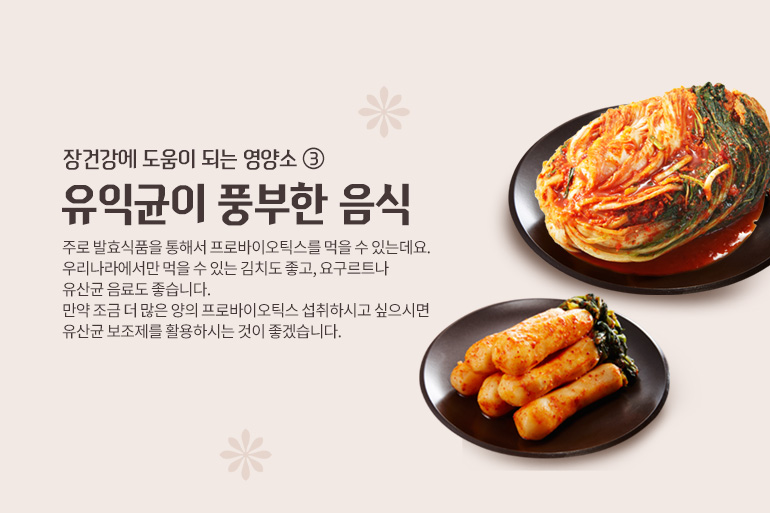마지막으로 '유익균' 자체가 풍부한 음식을 많이 먹으면 좋습니다. 주로 발효식품을 통해서 프로바이오틱스를 먹을 수 있는데요. 우리나라에서만 먹을 수 있는 김치도 좋고, 요구르트나 유산균 음료도 좋습니다. 만약 조금 더 많은 양의 프로바이오틱스 섭취하시고 싶으시면 유산균 보조제를 활용하시는 것이 좋겠습니다.