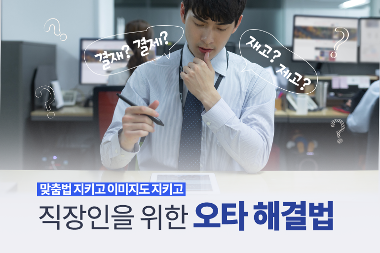 직장에서 메일을 쓰거나 보고서를 작성한 후 뒤늦게 오타를 발견하고는 부끄러웠던 경험, 한 번쯤 있으실 텐데요. 맞춤법에 대한 직장인들의 인식을 알아보는 설문조사에 따르면 약 67%의 응답자가 ‘업무 중 맞춤법을 틀리는 동료는 이미지가 나빠진다’고 답했다고 해요. 하지만 동시에 응답자의 73%가 ‘맞춤법 실수를 한 적이 있다’는 응답을 하기도 했죠.