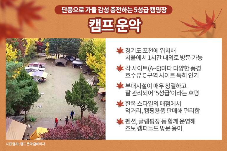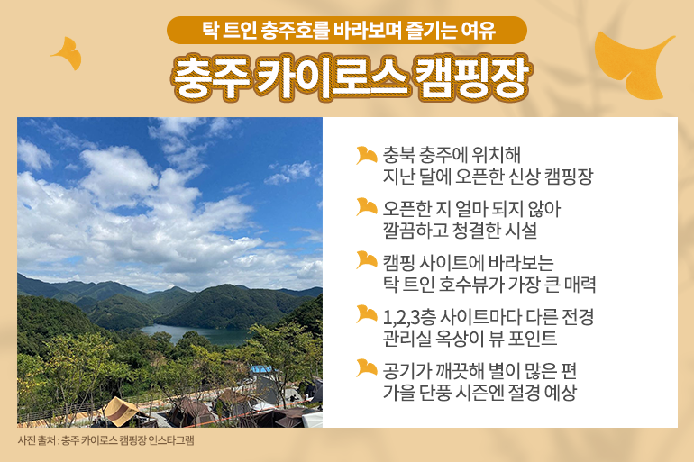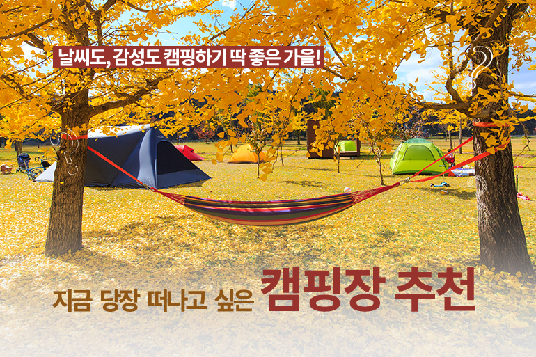 새파란 하늘, 깨끗한 공기, 알록달록 물들어 가는 단풍까지! 그야말로 사랑하지 않을 수 없는 계절, 가을입니다. 예년보다 더 쌀쌀한 날씨이긴 하지만, 가을 특유의 감성 덕분에 캠핑을 즐기기엔 이보다 좋은 날이 또 없을 텐데요. 길지 않은 가을을 제대로 만끽하고 싶은 캠퍼들을 위해 오늘은 가을에 빛을 발하는 캠핑장들을 여러분께 소개해 드리겠습니다 😊
