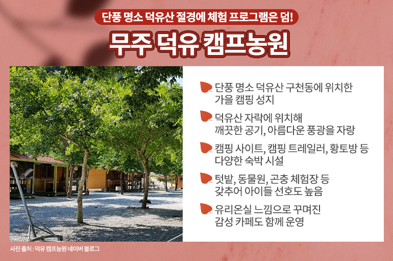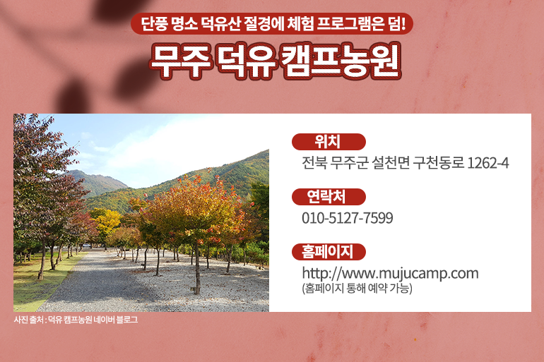 매년 가을이면 문전성시를 이루는 대표적인 단풍 명소들이 곳곳에 있죠. 그중에서도 덕유산 구천동은 전국에서 첫 손에 꼽히는 단풍 명소인데요. 무주에 위치한 ‘덕유캠프농원’은 덕유산의 단풍을 한적하게 즐길 수 있어 가을 캠핑의 성지로 불립니다. 덕유산 자락에 위치해 공기가 깨끗하고, 풍광이 아름다우며 캠핑장 옆으로 맑은 계곡이 흘러 자연의 낭만을 한껏 느낄 수 있죠. 다양한 풍경을 품은 캠핑 사이트와 편하게 이용 가능한 캠핑 트레일러, 뜨끈한 찜질을 즐길 수 있는 황토방 등으로 구성되어 있어요.