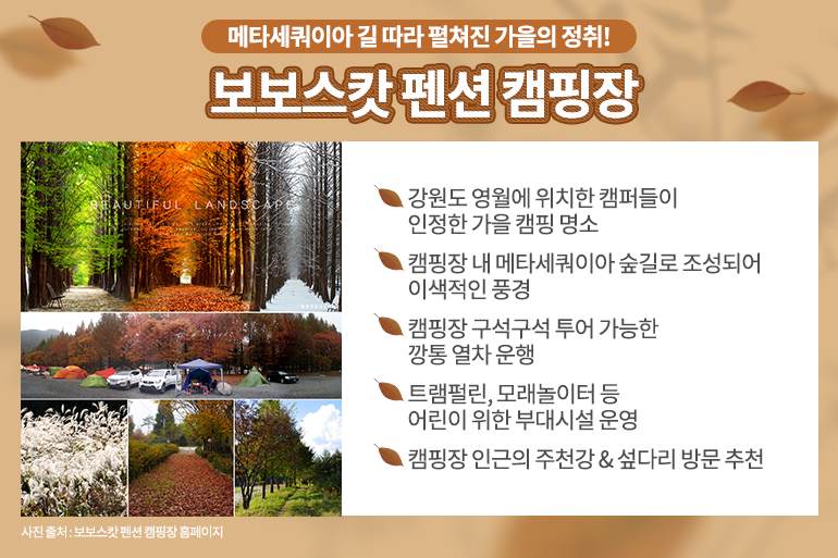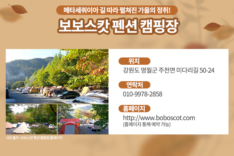 강원도 영월에 위치한 ‘보보스캇 캠핑장’은 가을의 정취를 가장 잘 느낄 수 있는 펜션으로 캠퍼들 사이에 정평이 난 곳이에요. 캠핑장 내에 높고, 곧게 뻗은 메타세쿼이아 숲길이 펼쳐져 사계절 내내 아름답고, 신비한 분위기를 자아내는데요. 특히 가을이면 푸르던 나무가 붉게 물들어 장관이 펼쳐진답니다. 사람들이 몰리기 전 일찍 도착해 숲길에 마련된 포토존에서 사진 촬영은 필수! 나무 사이사이 텐트를 설치할 수 있는 T 구역과 사이트에 차량 주차가 가능해 편리한 C 구역, 비교적 넓고 한적한 P 구역으로 나누어져 있으니 취향에 맞춰 구역을 선택하면 돼요.