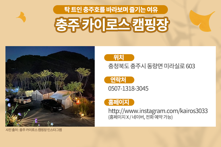지난 달 처음 문을 연 충주의 ‘카이로스 캠핑장’은 오픈 한 달 만에 캠퍼들 사이에서 입소문을 타면서 서서히 인기를 모으고 있는 캠핑 명소입니다. 신규 캠핑장인 만큼 시설이 깨끗하고, 관리가 잘 되어 있어 편리하게 이용할 수 있다는 것이 큰 장점이죠. 하지만 이곳의 진짜 매력은 아름다운 산으로 둘러싸인 캠핑 사이트에서 바라보는 충주호 뷰인데요. 탁 트인 호수를 바라보며 물멍을 즐기는 것만으로도 눈과 마음이 정화되는 기분을 느낄 수 있을 거예요.