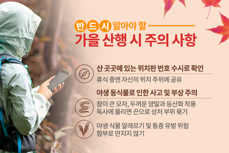 또한 산행을 하면서 곳곳에 있는 위치판 고유번호를 확인하고, 휴식 시에는 자신의 위치를 주위 사람들에게 알려두면 만일의 사고에도 빠르게 구조가 가능하죠. 가을 산에는 말벌, 독사 등이 활동할 위험이 있으니 창이 큰 모자, 두꺼운 양말과 등산화를 착용하고, 독사에 물린 경우 끈으로 상처 주변을 묶어 독이 퍼지지 않도록 하는 것이 바람직하답니다. 잎이나 줄기를 만지면 알레르기나 통증을 유발하는 식물들도 많으니 함부로 식물을 만지거나 먹지 않도록 주의해 주세요!