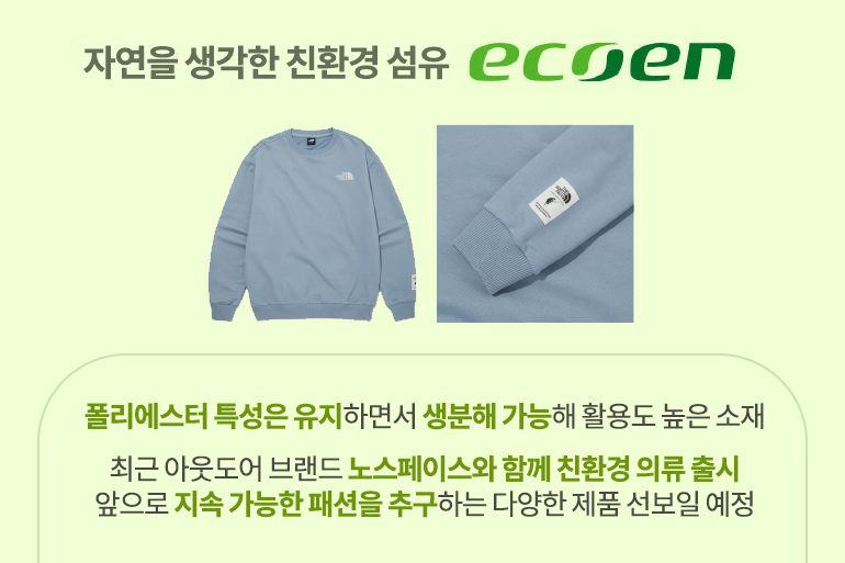 가을 산행은 자연이 우리에게 내어준 아름다운 것들을 누리는 시간인 만큼 아웃도어 제품 역시 환경을 생각한 소재를 선택하는 것이 의미있을 텐데요. 휴비스에서는 친환경 생분해 섬유 ‘에코엔(ecoen)’을 개발해 아웃도어 브랜드 노스페이스와 손잡고 친환경 의류를 출시했답니다. 세계 유수 화학 기업들이 자연 원료로 플라스틱을 개발해왔지만 물성이 약해 사용 범위 확대에는 제약이 있었는데요. 휴비스가 개발한 ‘에코엔’은 발상의 전환으로 썩는 폴리에스터를 개발해 폴리에스터의 물성은 유지하면서 생분해는 가능하도록 만든 것이죠. 앞으로도 지속 가능한 패션을 추구하는 다양한 제품을 출시할 예정이라고 하니 기대가 되네요!