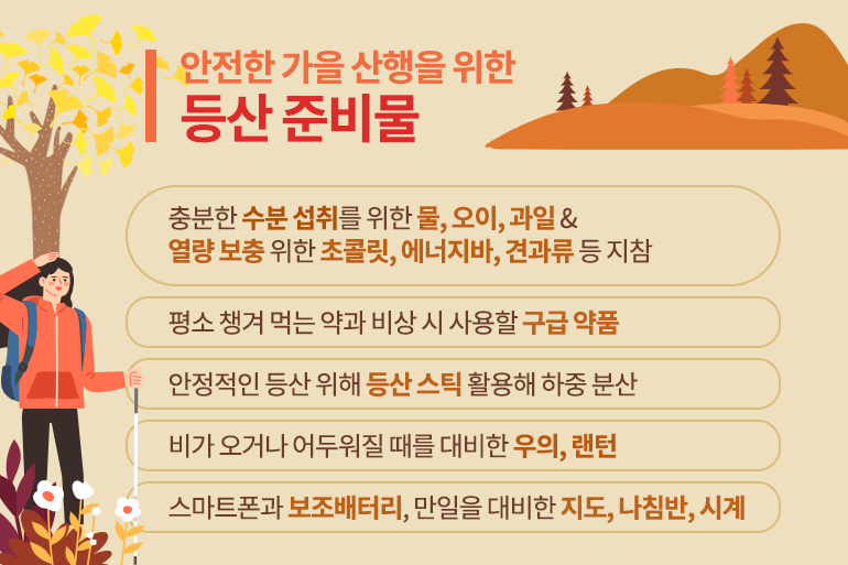 충분한 수분 섭취를 위해 물과 수분이 많은 오이, 과일 등이 필요하며 열량 보충을 위한 에너지바, 초콜릿, 견과류 등도 가을 산행에 빠져서 안 될 필수 아이템이죠. 평소 먹는 약이 있다면 미리 챙기고, 만일을 대비해 구급약품을 챙기는 것도 잊지 말아야해요. 미끄러운 가을 산길에서는 등산 스틱을 활용해 하중을 분산하면 안정적인 등산이 가능하며, 비가 올 때를 대비해 우의, 랜턴 등을 챙기는 것도 중요해요. 자신의 위치를 알리고, 날씨나 시간 등을 수시로 확인할 수 있도록 휴대전화와 보조배터리를 챙기고 만일을 대비해 지도, 나침반, 시계 등을 준비하면 유용할 거예요.