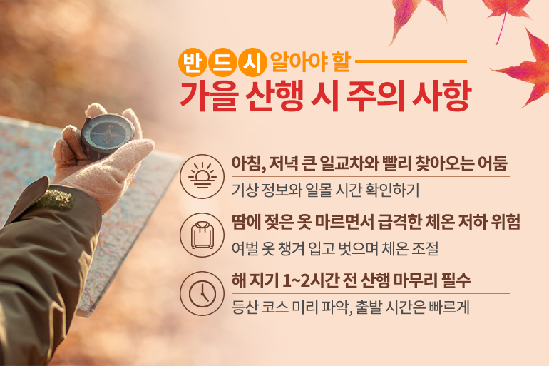 가을에는 아침, 저녁으로 일교차가 크고 해가 짧아져 빨리 어둠이 찾아오기 때문에 산에 오르기 전 기상 정보와 일몰 시간 등을 확인하는 것이 중요한데요. 특히 산에 오를수록 기온이 낮아지고, 땀에 젖은 옷이 마르면서 급격한 체온 저하를 유발할 수 있으니 여벌의 옷을 챙겨 날씨에 따라 옷을 입고, 벗으며 체온을 조절하도록 해주세요. 또한 해가 지기 1~2시간 전에는 산행을 마칠 수 있도록 출발 시간과 등산 코스 등을 미리 확인하고, 가급적 일찍 산행을 시작하는 것이 안전해요.