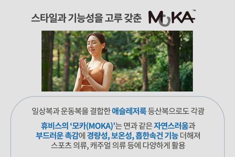 최근에는 젊은 층에서도 등산을 즐기는 비중이 커지면서 등산 패션에 대한 관심이 높아지고 있죠. 특히 일상복과 운동복을 결합해 스타일링을 하는 애슬레저룩을 등산복으로 활용하는 경우가 많은데요. 휴비스에서는 면과 같은 자연스러움과 부드러운 촉감에 스포츠 의류가 갖추어야 할 보온성, 경량성, 흡한속건 기능 등을 더한 ‘모카(MOKA)’를 개발해 애슬레저룩에 활용하고 있어요. ‘목화’ ‘면’을 떠올리게 하는 이름처럼 터치감과 감촉이 뛰어나며 자연스러운 아름다움을 드러낼 수 있어 다양한 스포츠 의류와 캐주얼 의류 등에 다방면으로 사용되고 있답니다.