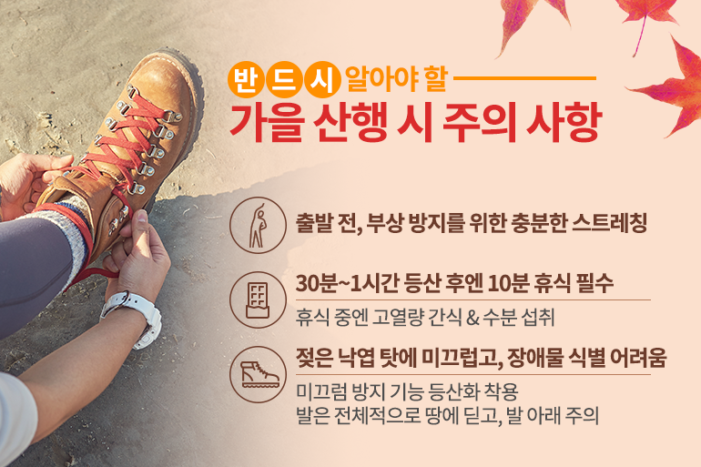 등산을 시작하기 전에는 부상을 방지하기 위해 충분한 스트레칭을 해주시고, 30분~1시간 등산 후에는 10분 내외로 휴식을 취하면서 체력을 보충해야 안정적인 산행이 가능하답니다. 휴식 중에는 가볍게 초콜릿, 과일, 견과류 등을 섭취하면서 열량을 높여주면 효과적이죠. 또한 가을 산에는 낙엽이 쌓여 길이 미끄럽고, 돌이나 장애물이 잘 보이지 않는데요. 따라서 미끄럼 방지 기능이 있는 등산화를 신고, 발바닥 전체로 땅을 딛으면서 발 아래를 꼼꼼히 살펴보는 것이 좋아요!
