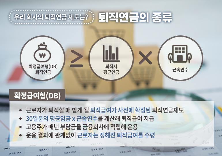 퇴직연금 제도는 확정급여형(DB), 확정기여형(DC), 개인형(IRP)으로 나누어지는데요. 그중 확정급여형(DB)의 경우 근로자가 퇴직할 때 받게 될 퇴직급여가 사전에 확정된 퇴직연금제도를 뜻해요. 퇴직 시 30일분의 평균임금 x 근속연수를 계산해 퇴직급여가 지급되죠. 고용주가 매년 부담금을 금융회사에 적립해 책임지고 운용하며, 운용 결과에 관계없이 근로자는 정해진 퇴직급여를 수령하는 방식이에요.