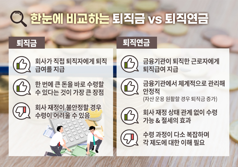 우선 퇴직금과 퇴직연금의 가장 큰 차이는 퇴직금의 경우, 회사가 퇴직자에게 퇴직급여를 지급하는 것이고, 퇴직연금은 금융기관이 퇴직을 한 근로자에게 퇴직급여를 지급하는 거예요. 회사에서 지급하는 퇴직금은 한 번에 큰돈을 바로 수령할 수 있다는 것이 가장 큰 장점인데요. 하지만 회사 재정이 불안정할 경우 수령이 어려울 수 있다는 치명적인 단점이 있죠.