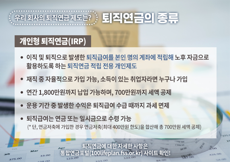 개인형 퇴직연금제도(IRP)는 근로자가 직장을 옮기거나 퇴직하면서 받은 퇴직급여를 본인 명의 계좌에 적립해 노후 자금으로 활용하도록 하는 퇴직연금 적립 전용 개인제도를 뜻해요. 재직 중 자율적으로 가입이 가능하며, 소득이 있는 취업자라면 누구나 가입할 수 있어요. 연간 1,800만 원까지 납입이 가능하며, 700만 원까지 세액공제가 되기 때문에 유용하죠. 운용 기간 중에 발생한 수익은 퇴직급여 수급 때까지 과세가 면제되며, 퇴직급여는 연금 또는 일시금으로 수령할 수 있답니다. (* 단, 연금저축에 가입한 경우 연금저축(최대 400만 원 한도)을 합산해 총 700만 원 세액 공제)