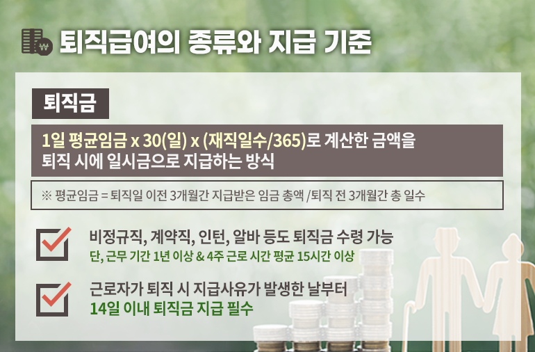 ‘퇴직금’의 경우에는 1일 평균임금 x 30(일) x (재직일수/365)로 계산한 금액을 퇴직 시에 일시금으로 지급하는 방식이에요. 여기서 ‘평균임금’은 퇴직일을 제외하고 퇴직금 산정의 사유가 발생한 날 이전의 3개월 동안 지급된 임금 총액을 일수로 나누어 산정하게 돼요. 정규직이 아닌 비정규직, 계약직, 인턴, 알바 등도 퇴직금을 수령할 수 있는데요. 다만 근무 기간이 1년 이상이며, 4주 근로 시간 평균 15시간 이상이 되어야 수령이 가능해요. 근로자가 퇴직한 경우 지급사유가 발생한 날부터 14일 이내에는 반드시 퇴직금을 지급해야 한답니다.