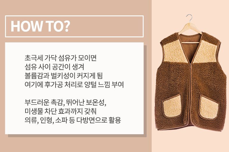 그렇다면 ‘젠토스’ 섬유는 어떻게 이런 느낌을 구현할 수 있을까요? 초극세의 가닥 섬유가 모이면 섬유 사이에 공간이 생기면서 볼륨감과 벌키성이 생기게 되는데요. 여기에 후가공 처리를 해 양털 느낌을 부여하면 풍성하고, 폭신폭신한 느낌의 ‘젠토스’ 원단이 탄생하는 것이죠. 이렇게 만들어진 ‘젠토스’는 촉감이 부드럽고, 보온성이 높으며 고밀도로 제작 시 유해 미생물을 차단해 알레르기에 대한 안전성 또한 뛰어나요. 덕분에 양털 코트나 점퍼 외에도 인형, 소파, 가구, 속옷, 타월 등 다방면으로 활용되고 있답니다.