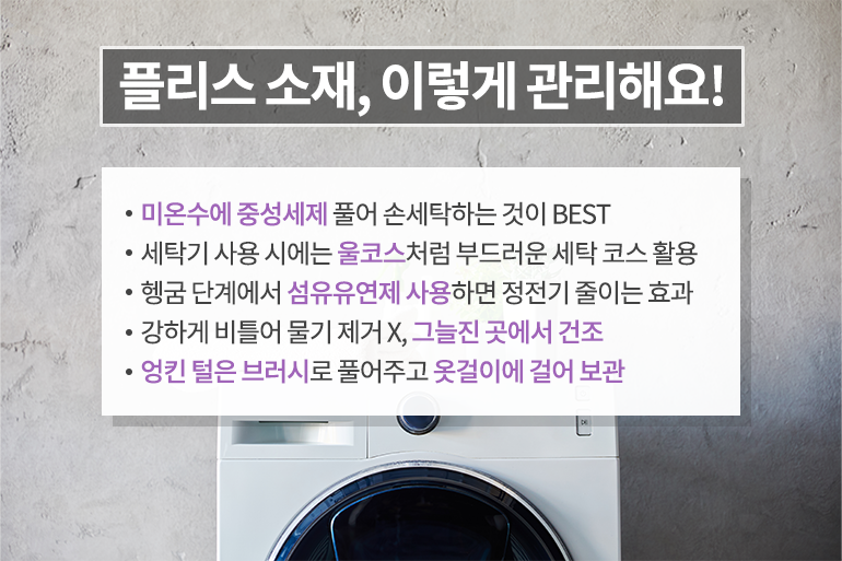 플리스는 겨울 아우터에 주로 사용하는 소재지만 무게가 가볍고, 건조성이 뛰어나 세탁이나 관리 또한 매우 용이한 편이에요. 세탁을 할 때는 미온수에 중성세제를 풀어 손세탁을 해주는 것이 원단 손상을 줄이는 가장 좋은 방법인데요. 만약 세탁기를 사용한다면 울코스처럼 부드러운 세탁이 가능한 코스를 사용하는 것이 좋아요. 참고로 헹굼을 할 때 약간의 섬유유연제를 넣어주면 플리스 특유의 정전기 발생을 줄이는 효과가 있어요.