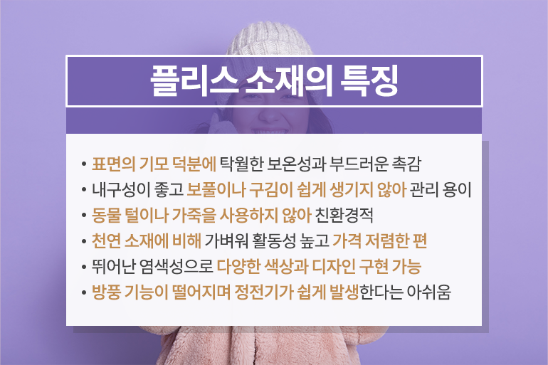 보글보글한 털이 생명인 ‘플리스’는 원단 자체에 부드러운 보풀을 발생시켜 천연 양털과 비슷한 느낌을 구현하는데요. 표면의 기모 덕분에 보온성이 탁월하며, 촉감 역시 부드러워 겨울철 의류에 활용하기에 제격이죠. 내구성이 좋고, 보풀이나 구김이 쉽게 생기지 않아 관리 또한 용이해요. 또한 동물의 털이나 가죽이 아닌 자연 소재를 활용해 친환경적인 것은 물론 천연 소재에 비해 무게가 가볍고 활동성이 높으며, 상대적으로 저렴하다는 것도 큰 장점이에요.