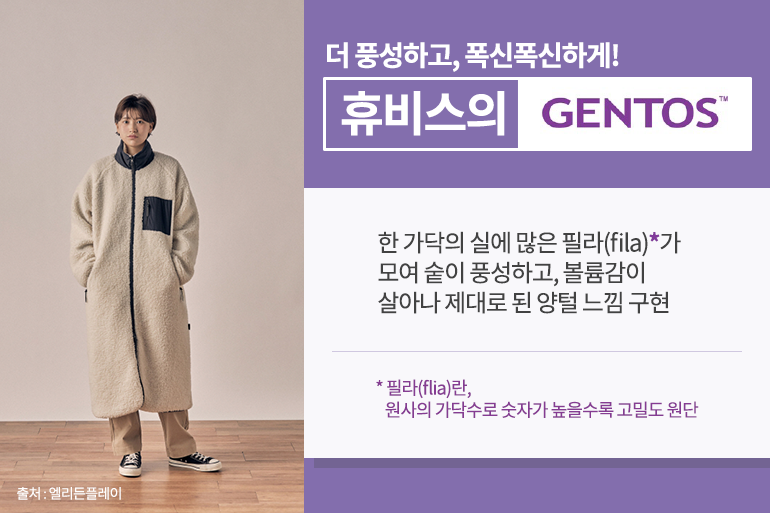 플리스 특유의 양털 느낌을 더 잘 살리기 위해선 머리에 펌(파마)을 하듯 섬유에도 펌을 풍성하게 해주는 것이 중요한데요. 우리의 머리카락도 얇고, 숱이 많으며, 곱슬머리일 때 펌이 잘 나오듯이 섬유도 가늘고, 숱이 많을수록 펌이 잘 살아나요. 휴비스에서 개발한 섬유 ‘젠토스’는 한 가닥의 실에 많은 필라(fila, 가닥)가 모여 있어 숱이 풍성하고, 볼륨감이 살아나 양털의 느낌을 제대로 구현해낼 수 있죠.