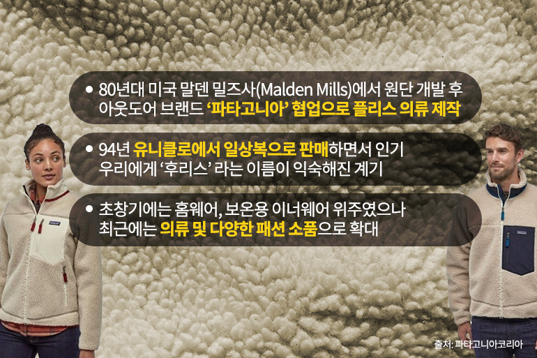 이후 아웃도어 브랜드 ‘파타고니아’와의 협업해 옷의 형태로 만들면서 본격적인 ‘플리스’의 시대가 열렸어요. 94년에 일본 패션 브랜드 ‘유니클로’가 플리스 자켓을 일상복으로 판매하면서 큰 인기를 끌었고, 이로 인해 일본식 표현인 ‘후리스’라는 말이 우리에게 친숙해지게 되었죠. 초기에는 겨울철 홈웨어, 패딩이나 코트 안에 입는 보온용 이너웨어가 대부분이었는데요. 최근에는 점퍼, 코트, 조끼, 스웨트 셔츠 등의 의류는 물론 모자, 장갑, 담요 등 다양한 제품에 활용되고 있답니다.